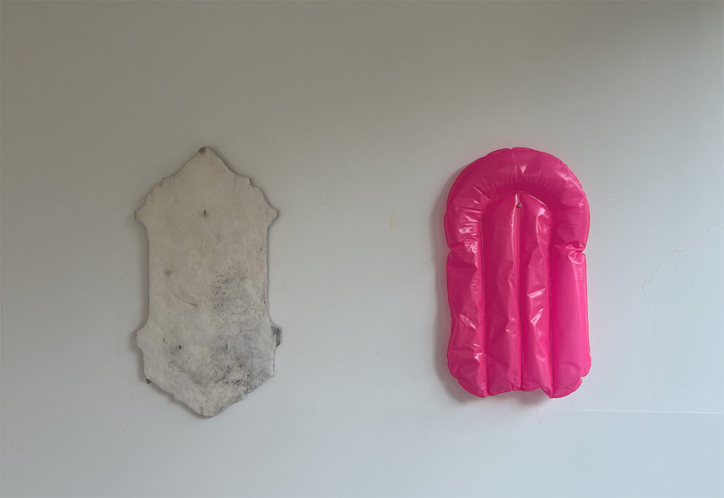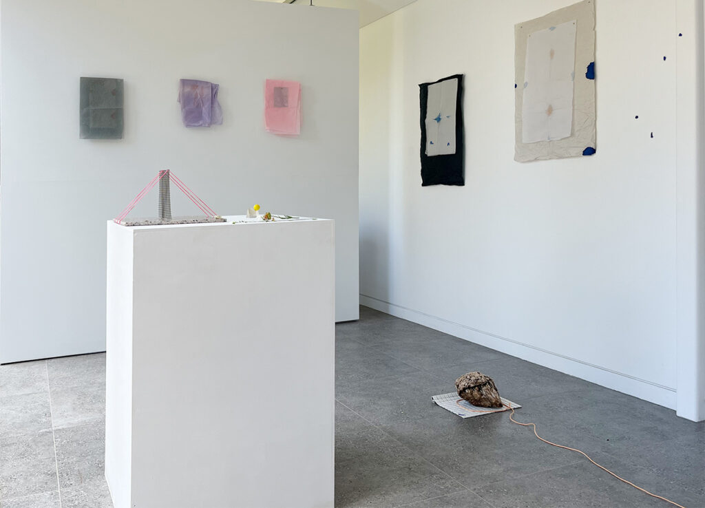 Chalk wall drawing, rubber exercise band, bread board, rock, painting on canvas, painting on linen/board, cardboard, wood