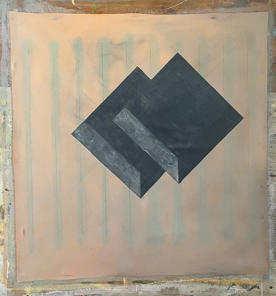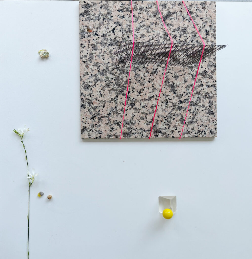 painted pegboard, steel tube, builders twine, pigmant coloured quartz, oil sitck