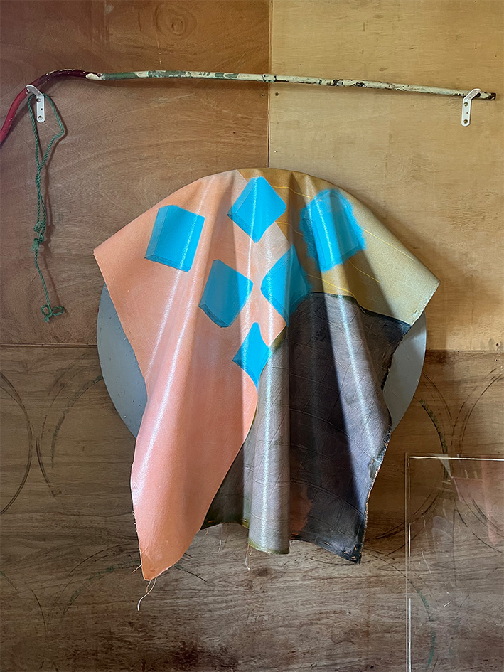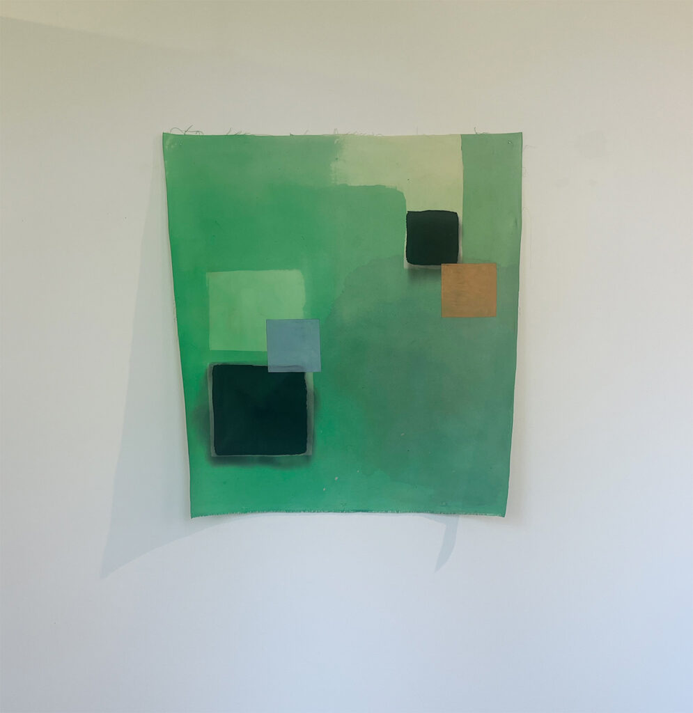 Acrylic on unstretched canvas, cardboard tube, builders twine